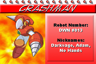 Since being reprogrammed by Dr. Wily with the ìDarksageî personality, Crashman has been more focused on scamming and conning than with violence.  Crashmanís new personality was made to help Dr. Wily make a dishonest buck and help fund his world domination plans.  However, Crashman hides some of his loot from Wily, planning his own futureÖ